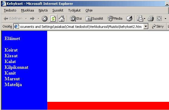 13. Tee kehystenmäärittelytiedosto, joka jakaa sivun kahteen sarakkeeseen ja oikean puoleisen sarakkeen kahteen riviin. Vasemman puoleinen sarake on 150 pikseliä ja nimeä se linkkikehys-nimiseksi HTML-dokumentiksi. Oikean puoleinen sarake varaa jäljellä jäävän tilan selainikkunasta, ja se jaetaan kahteen riviin, alempi rivi 10 prosenttia ja loput 90 prosenttia, ja tallenna ylempi rivi oikeakehys-nimiseksi ja alempi rivi alakehys-nimiseksi HTML-dokumentiksi. Tallenna määrittelytiedosto nimellä Harjoitus13.htm. Vasempaan kehykseen tee linkkejä (vähintään viisi), linkkien viittaamien tiedostojen tulee avautua oikean puoleisessa kehyksessä, niin että alakehys on koko ajan näkyvillä kuten myös vasemman puoleinen kehyskin. Ala olevassa kuvassa on vähän mallia tehtävään.